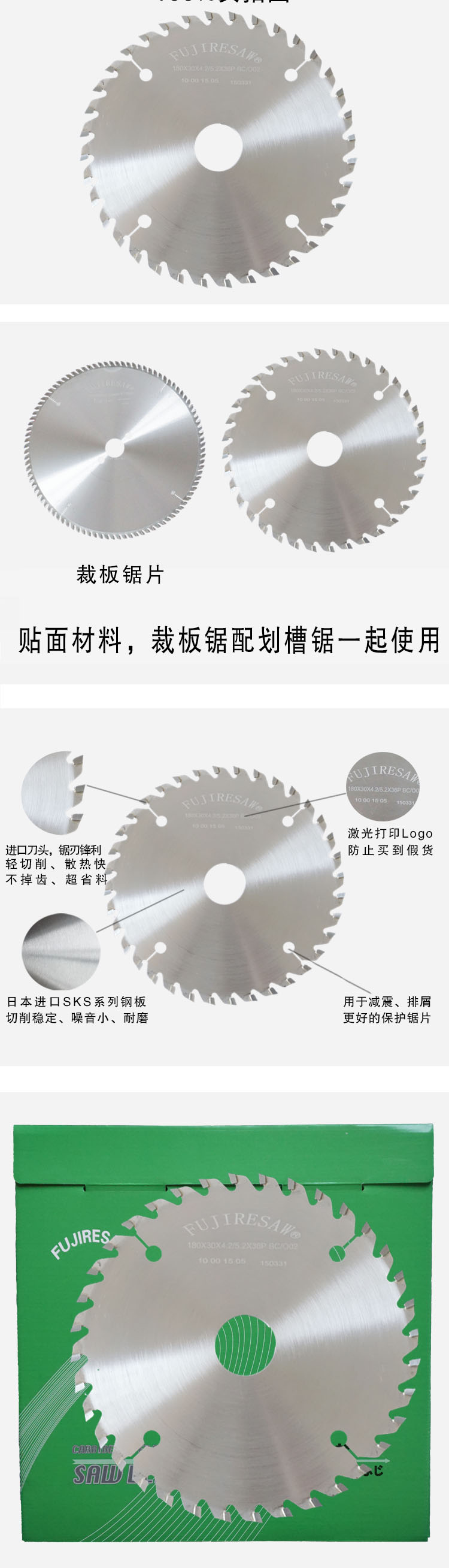 特點:鋸片適于切割35mm以下硬質貼面刨花板、密度板、多層板,板材可多張層疊。如有貼面材料,需佩帶劃槽鋸片;